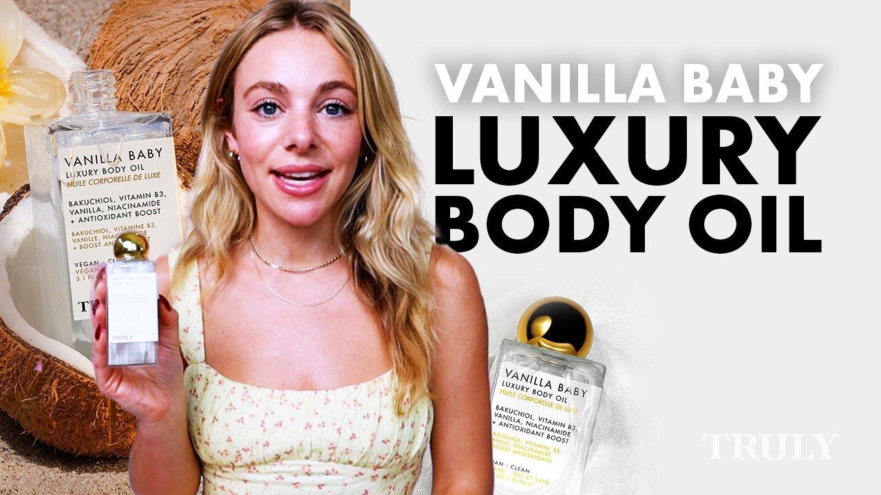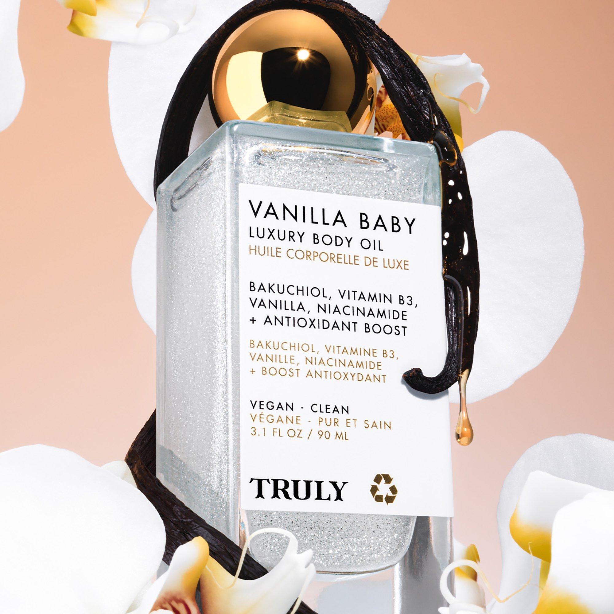 Truly’s Vanilla Baby Luxury Body Oil blends bakuchiol and vitamin B3 to reveal firm, renewed skin with a glistening, satin-like finish.