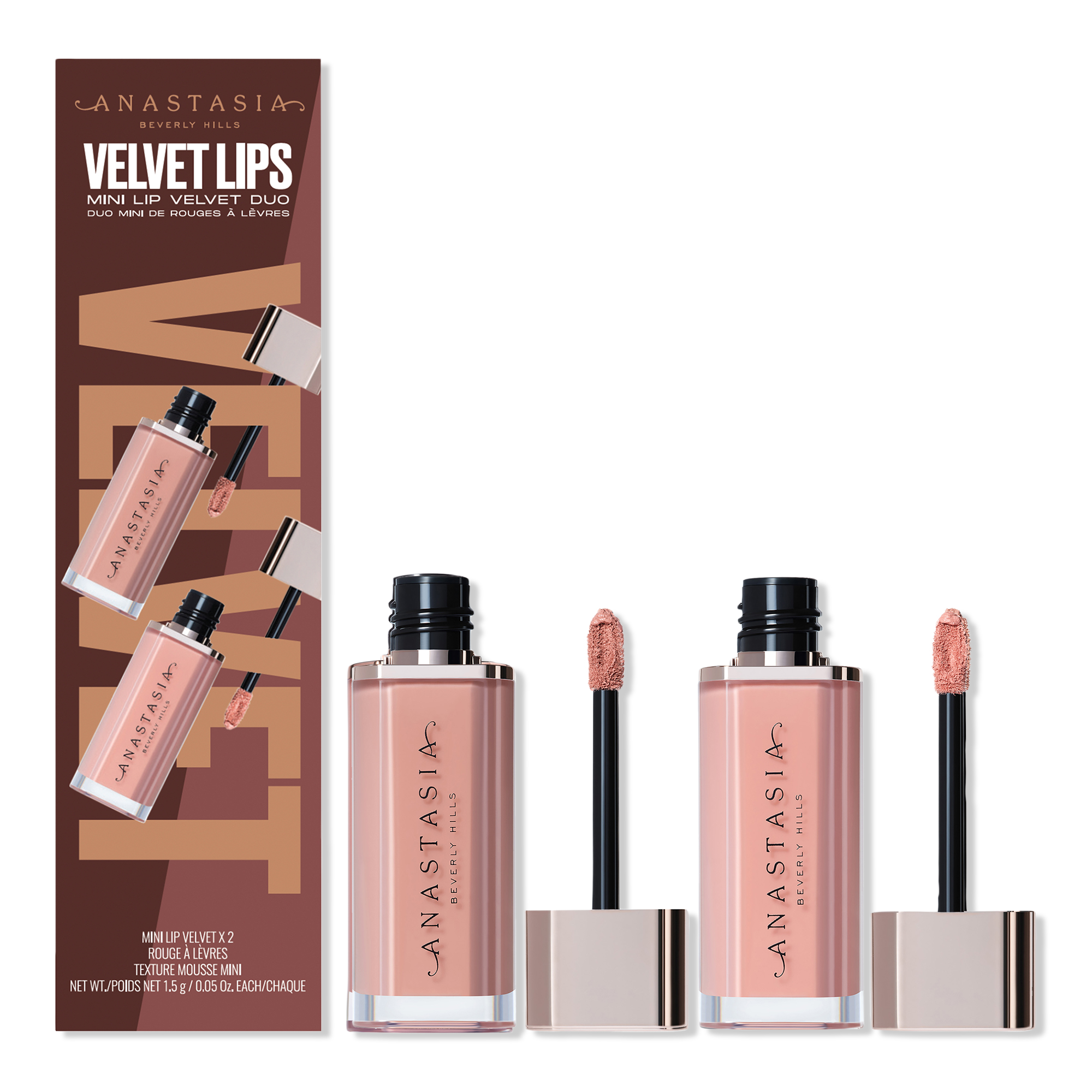 A duo of best-selling, velvet-smooth Anastasia Beverly Hills Mini Lip Velvet lip mousse with weightless, full pigment, true-matte color, cushioned, comfortable wear and a smoothing lip finish that allows you to line and apply with a multifunctional, teardrop-shaped cushioned wand.
