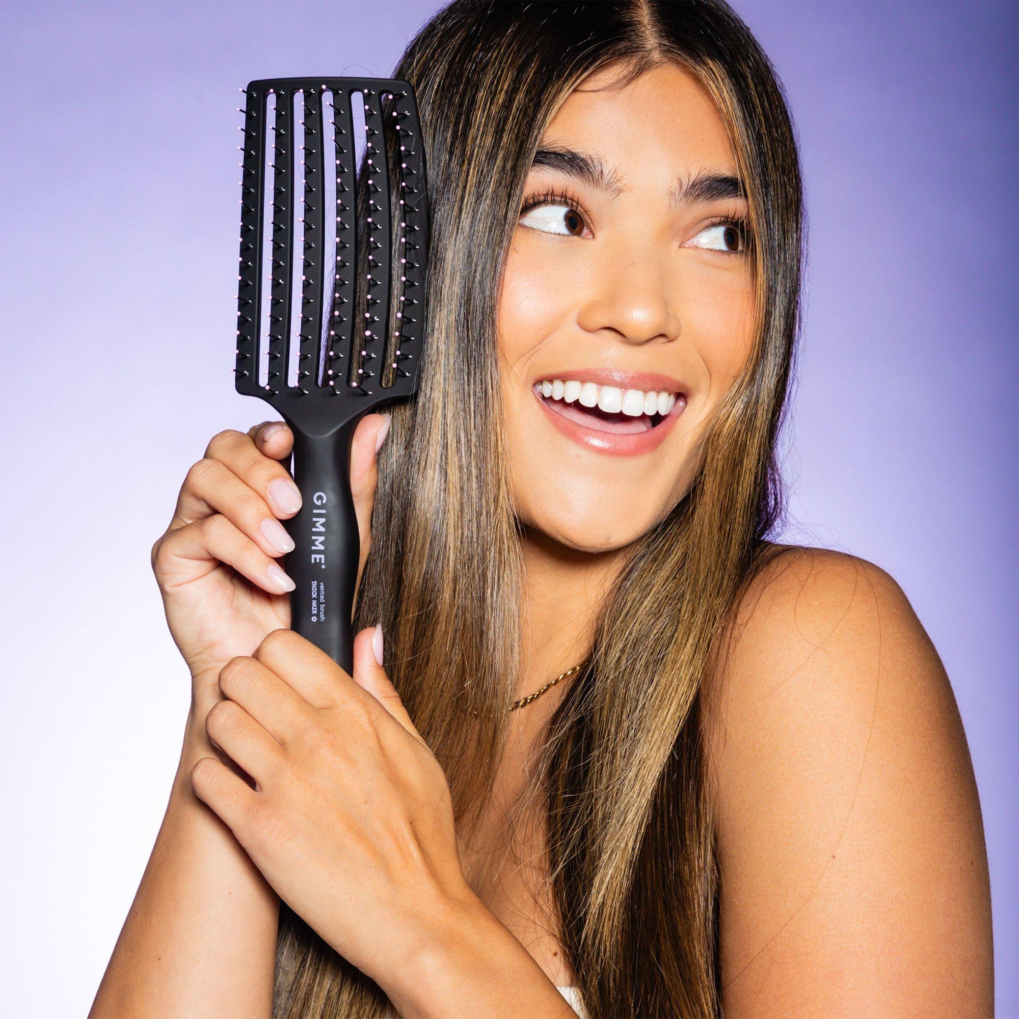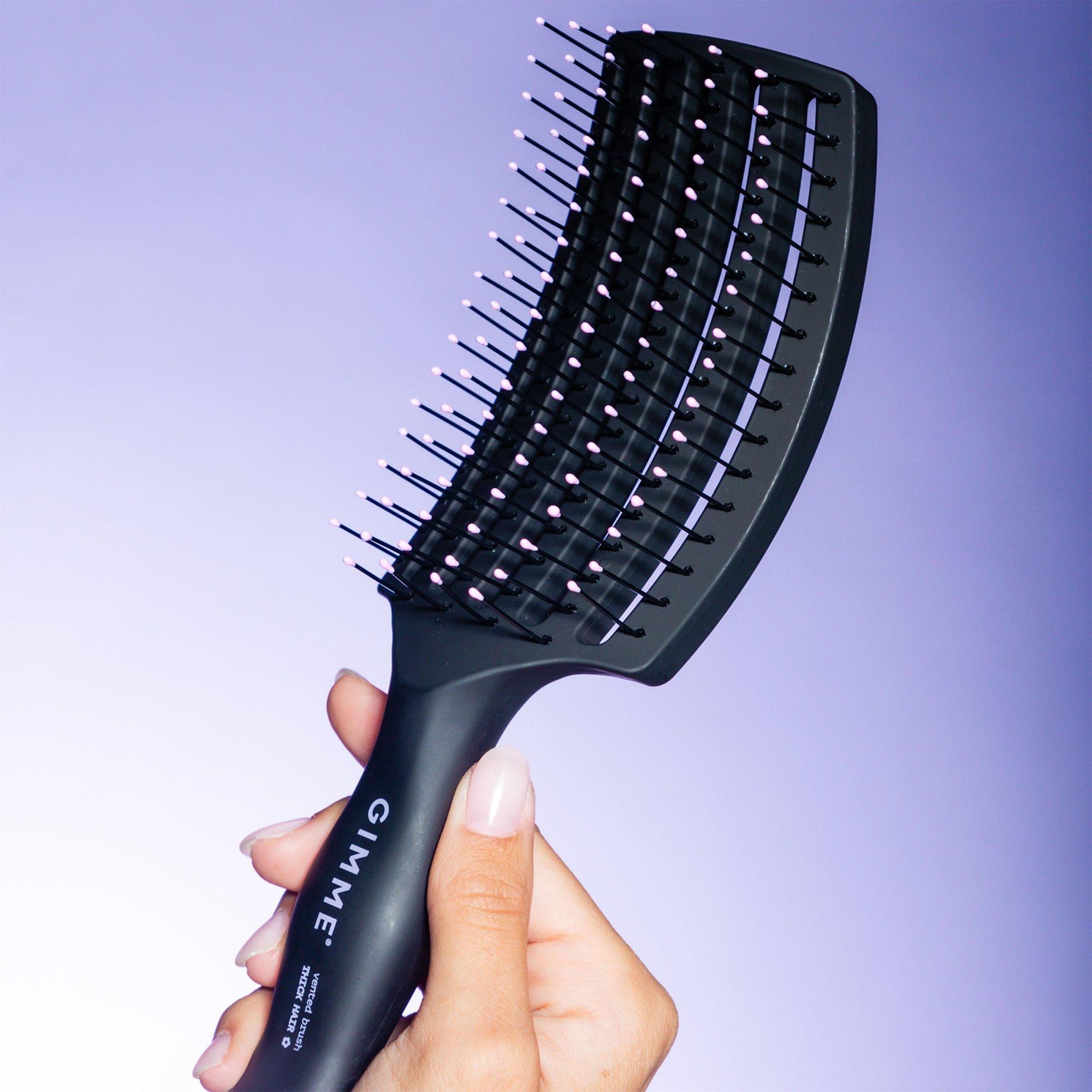 Gimme Beauty's Vented Detangling Brush. This brush's temperature-resistant bristles let you bring on the heat with a vented design allowing for maximum airflow, to speed up your dry time. This brush's curved shape & ball-tipped bristles are gentle on the scalp.