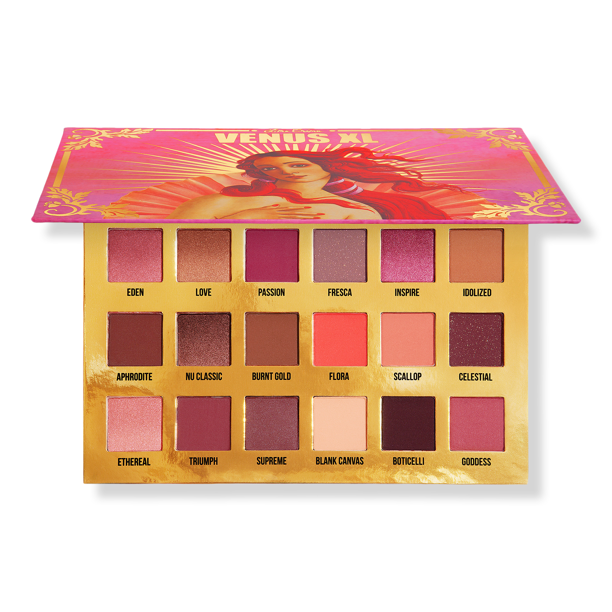 Lime Crime Venus XL Palette features 16 highly-pigmented shades in a range of romantic reds & pinks with supreme color payoff that doesn't fade or fall-out.