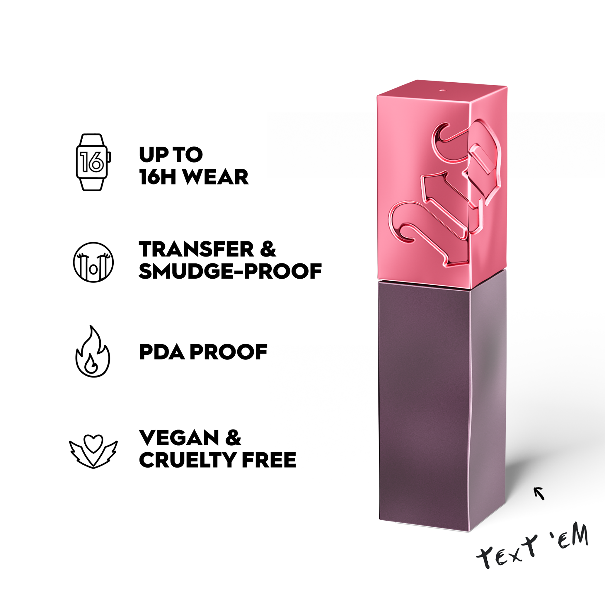 3 Steps to unbreakable lip color: 1. Shake the liquid lipstick for five seconds to activate the innovative color and shine formula. 2. Apply and let set until dry* --- the longer it sets, the better it gets! *Average recommended drying time is 4 minutes, for ultimate longwear. **For best results, keep your lips from touching while formula dries. No worries, there's a lot you can do in those 4 minutes -- text your bestie, organize your UD faves, or scroll through your feed. 3. Dominate with up to 16 hours of color-intensity and performance -- this forumla is Transfer-Resistant + Food-resistant + PDA-Approved Whether you're looking for an intense red lipstick shade (like Unbreakable), a classic nude (like Safe Word) or a bold purple lip (like No Restraints), new Vice Lip Bond Glossy Liquid Lipstick has the perfectly pigmented long-lasting lip color for you.