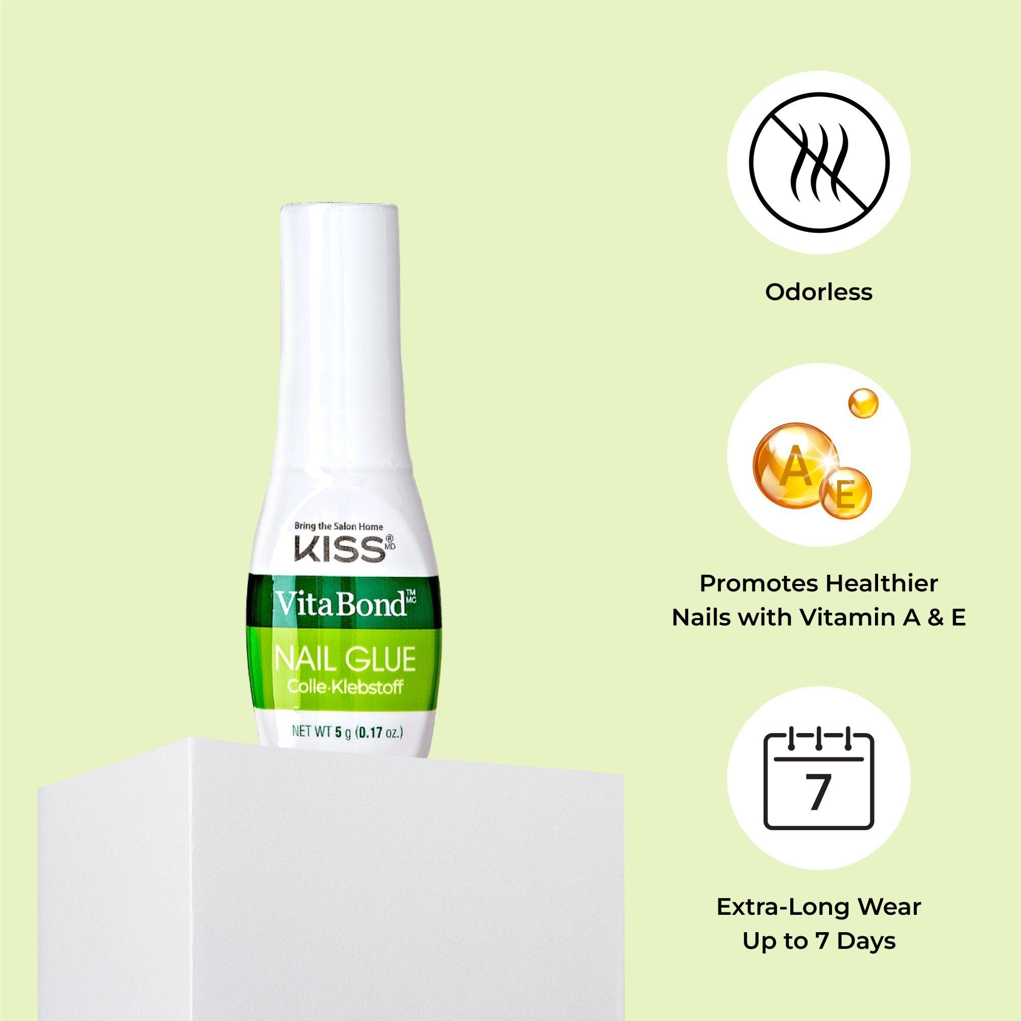 Kiss VitaBond Brush-On Nail Glue is gentle, vitamin-infused, sets in seconds & instantly bonds your fake nails to your natural nails for up to 7 days. VitaBond Nail Glue is used to apply artificial nails, tips and wraps, while it can also instantly repair nail breaks & tears on your natural nails.