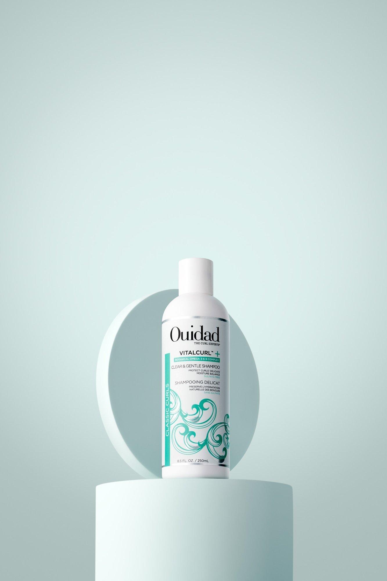 Ouidad's VitalCurl+ Clear & Gentle Shampoo protects curls' delicate moisture balance while cleansing and rebalancing pH levels for optimal curl health and consistency.