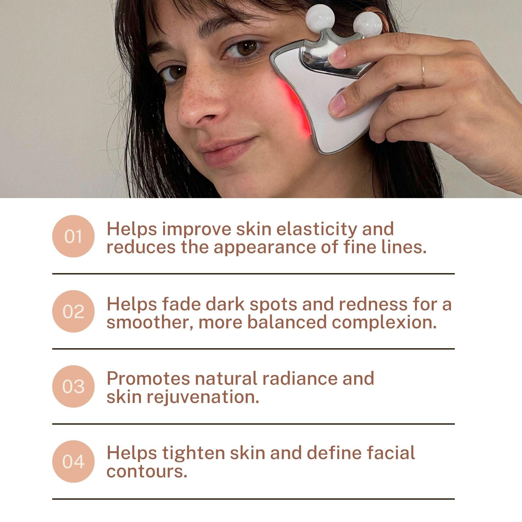 • 4-in-1 design combining red LED, heat, gua sha, and sculpting rollers