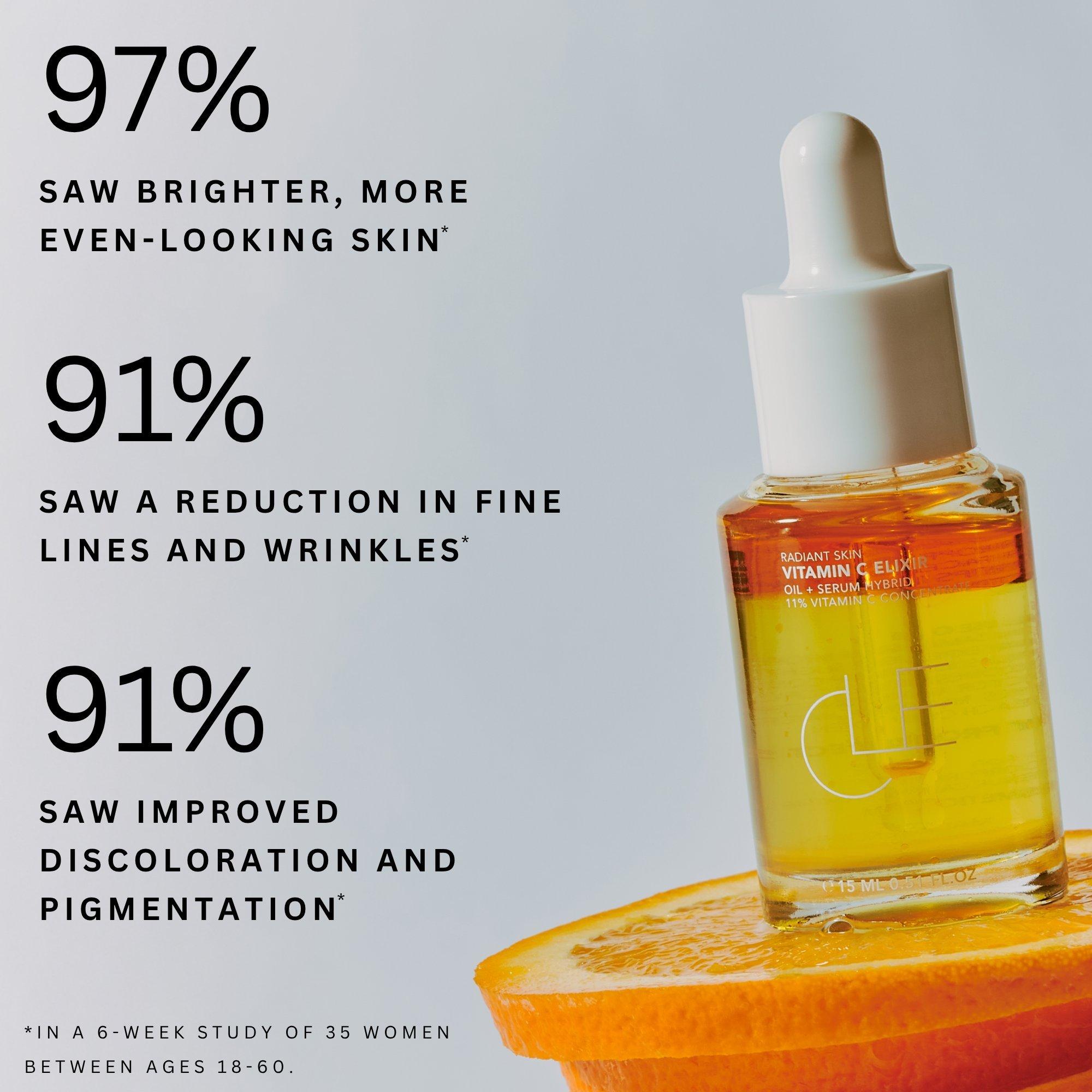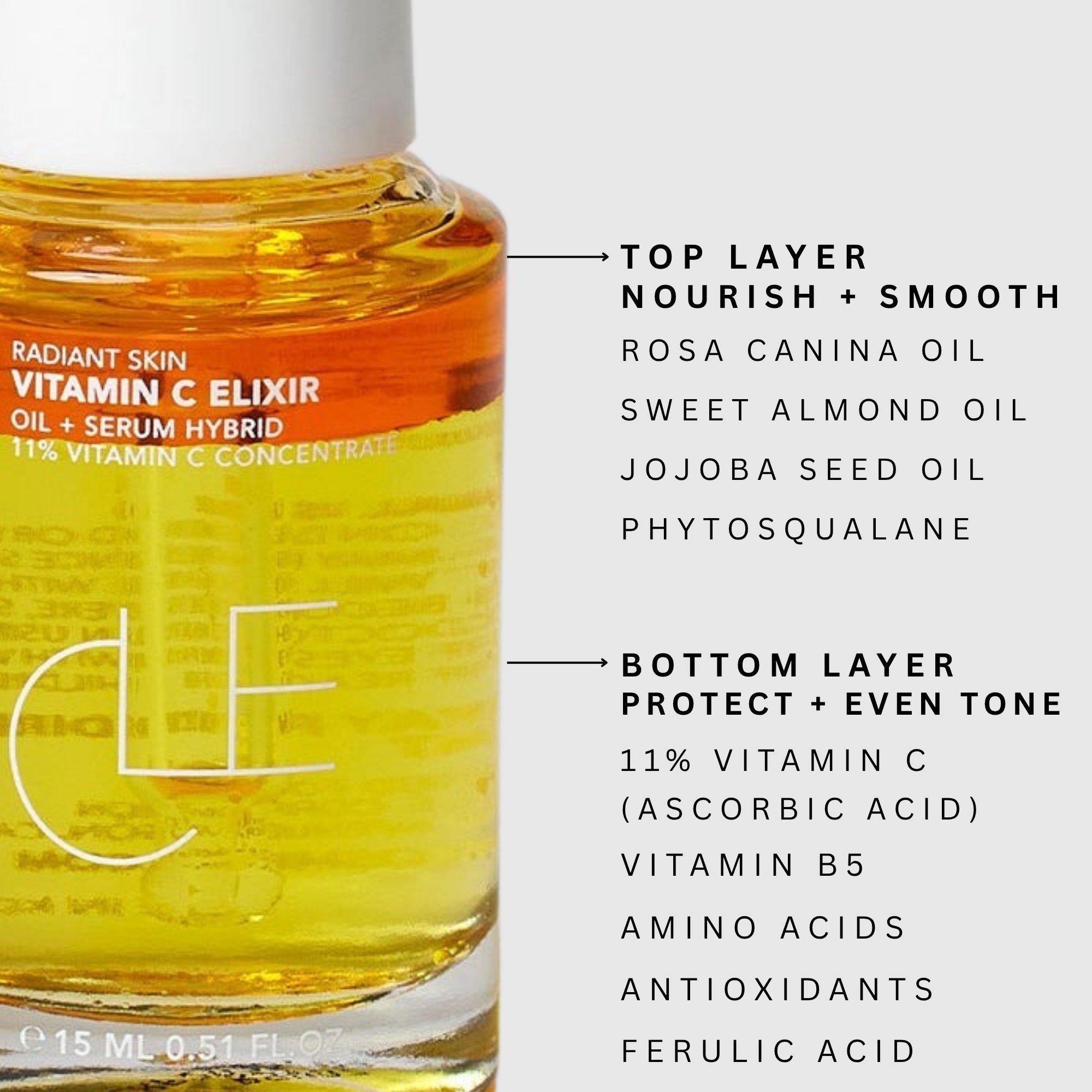 CLE Cosmetics Vitamin C Elixir is a 2-in-1 oil and serum hybrid powered by 11% pure Vitamin C. This brightening formula helps improve skin tone, boost radiance, and support smoother, more hydrated-looking skin over time.