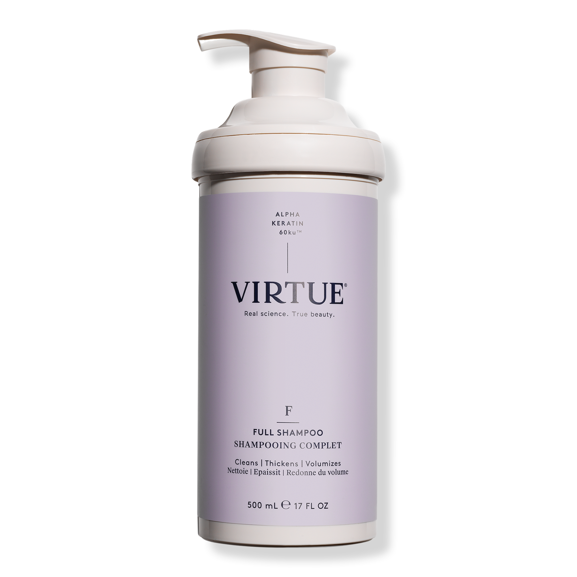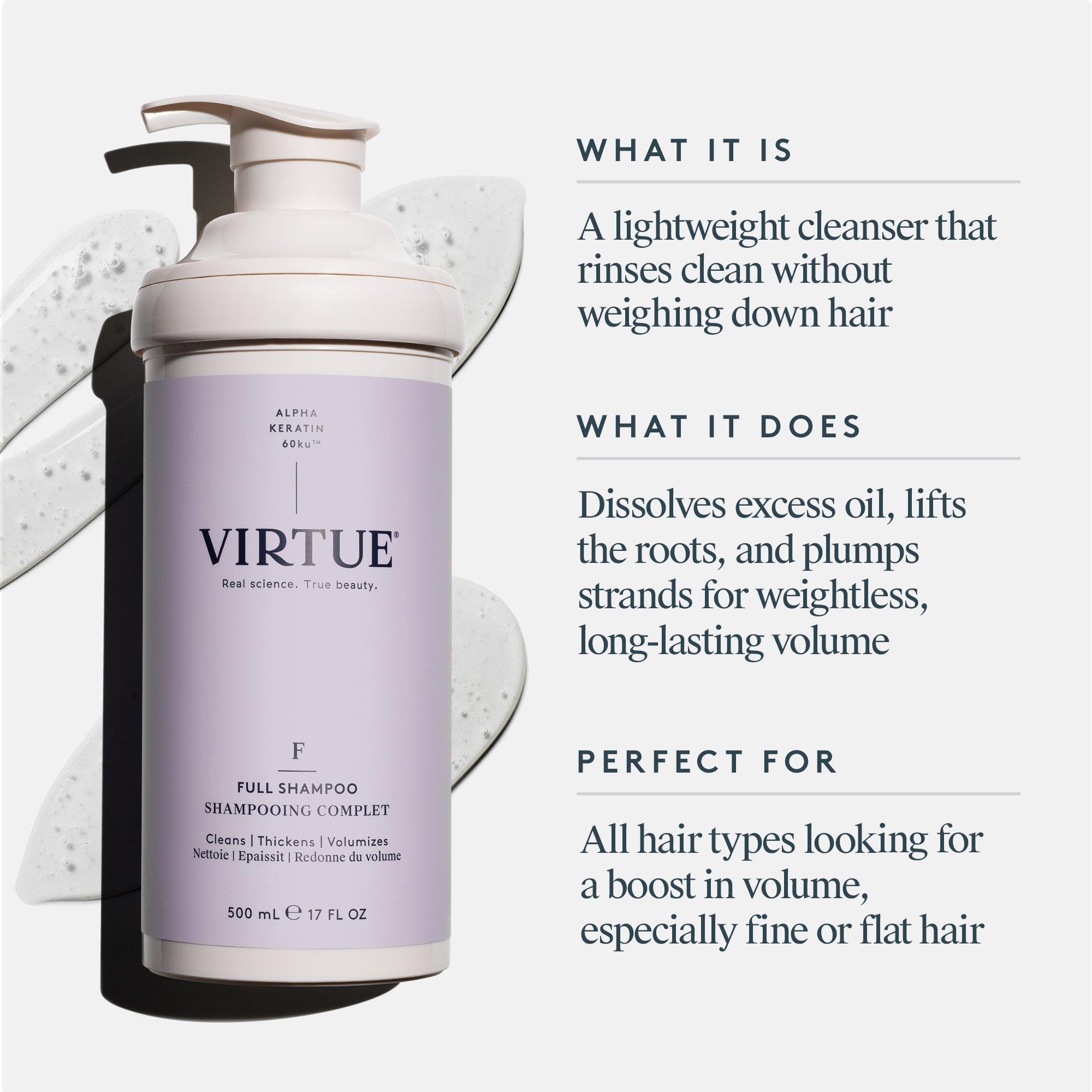 • Infused with Virtue's first-of-its-kind Alpha Keratin 60ku protein, Full Shampoo was specifically developed to add volume and density to fine, limp hair strands.