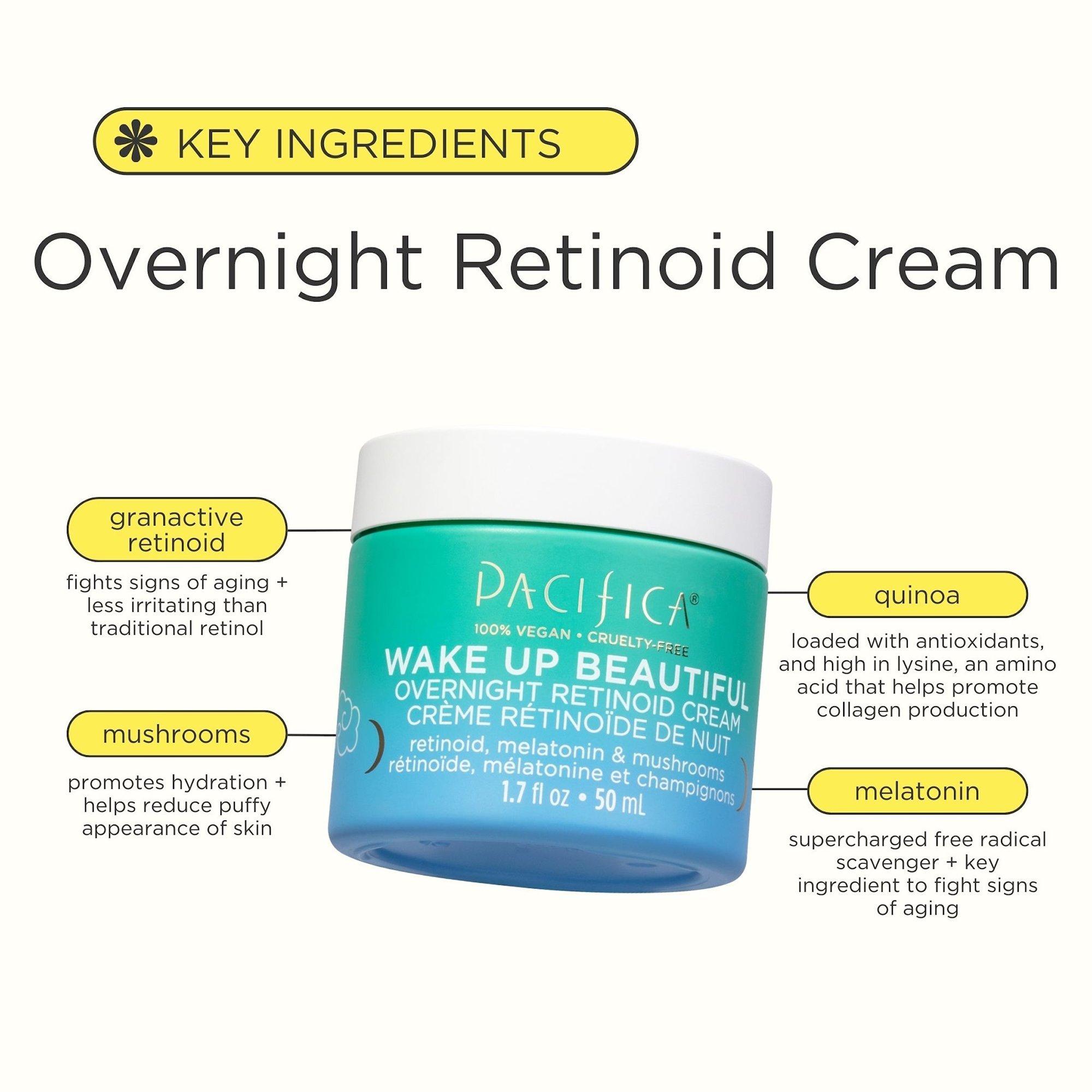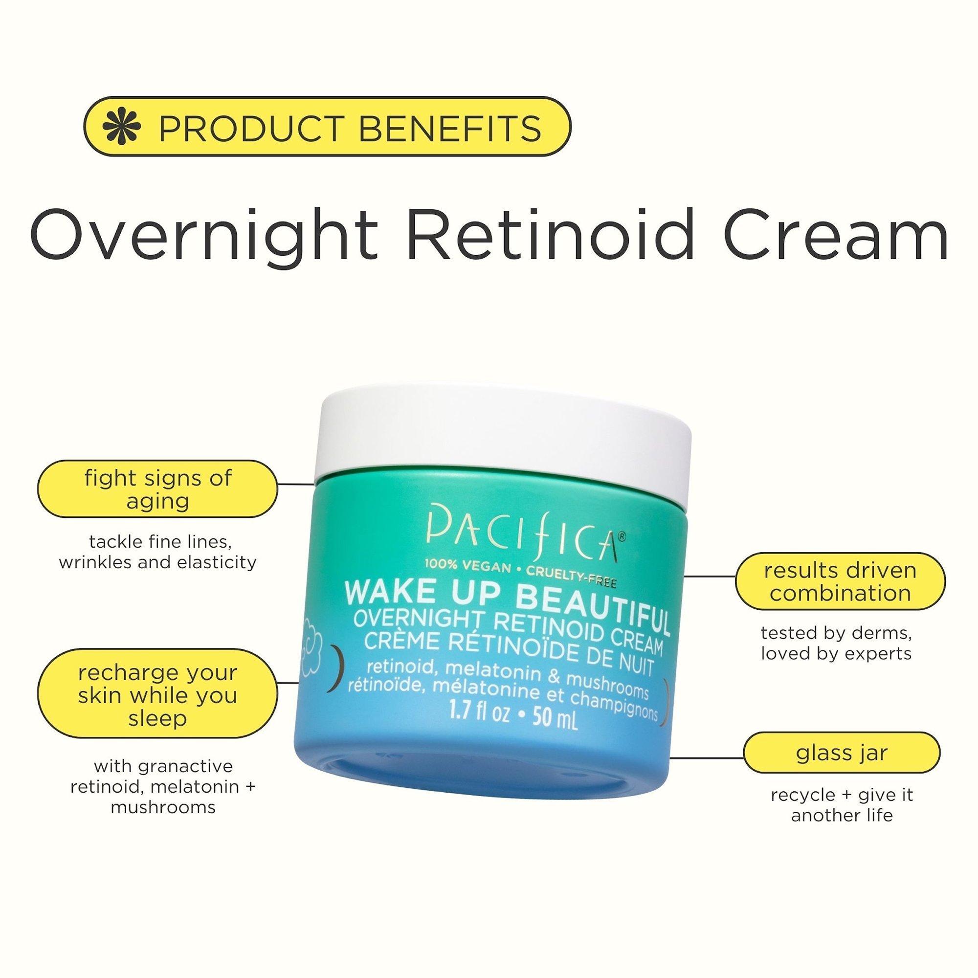 Pacifica's Wake Up Beautiful Retinoid Cream is packed with clinically studied ingredients and beneficial naturals to hydrate skin and address signs of aging.