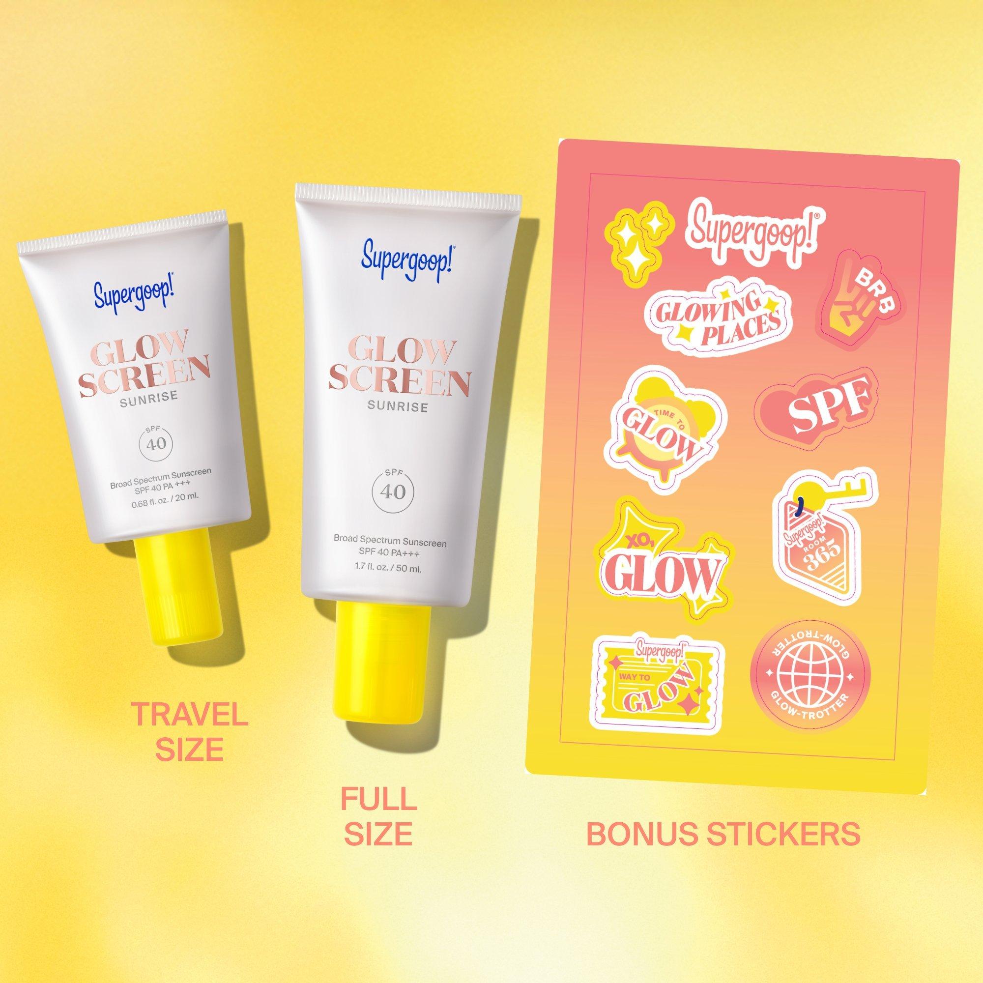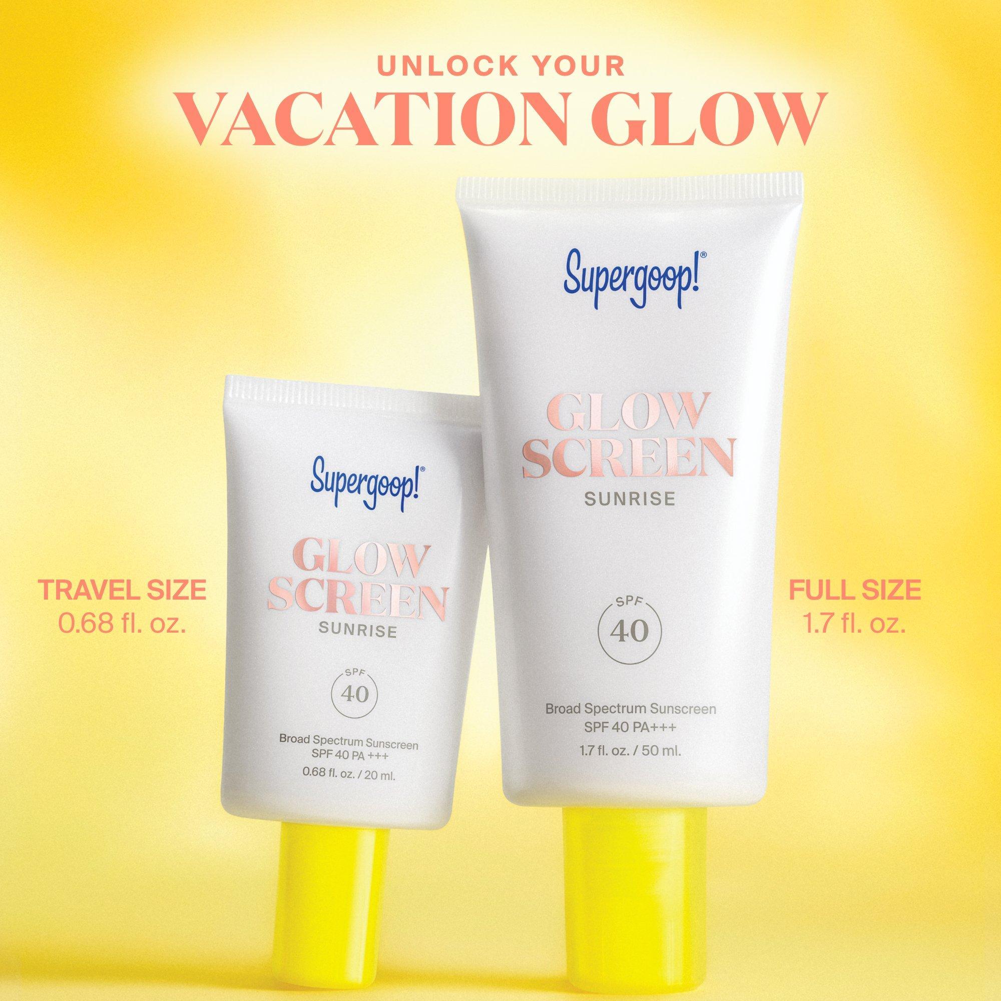 Supergoop! Wake Up & Glow Sunkissed Duo includes the cult favorite glowy sunscreen primer in full size and travel size — for an instantly sunkissed glow plus SPF protection at home and on vacay!