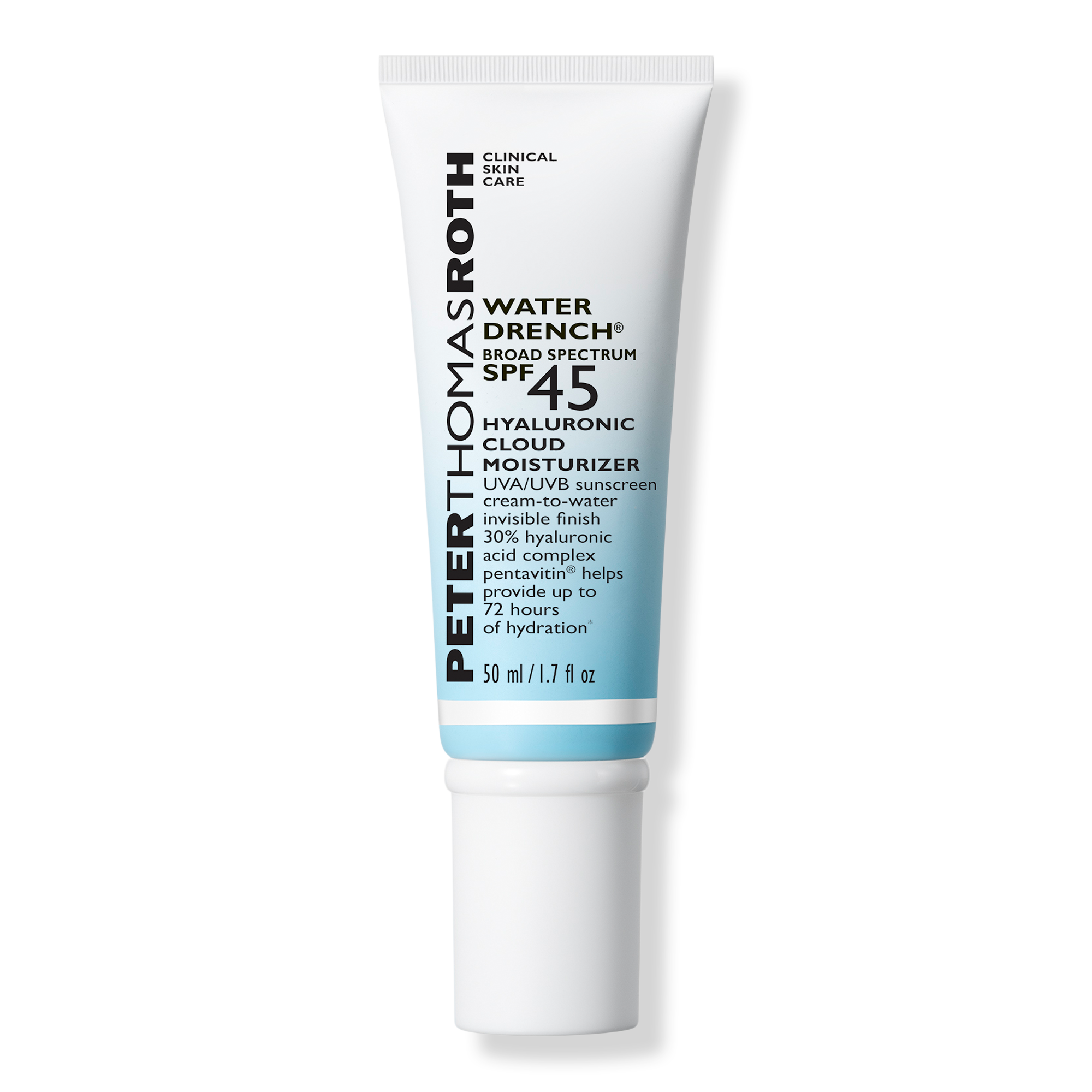 Peter Thomas Roth's Water Drench Hyaluronic Cloud Moisturizer SPF 45 is a water-resistant sunscreen with a hydrating 30% hyaluronic acid complex, unique water-break texture.