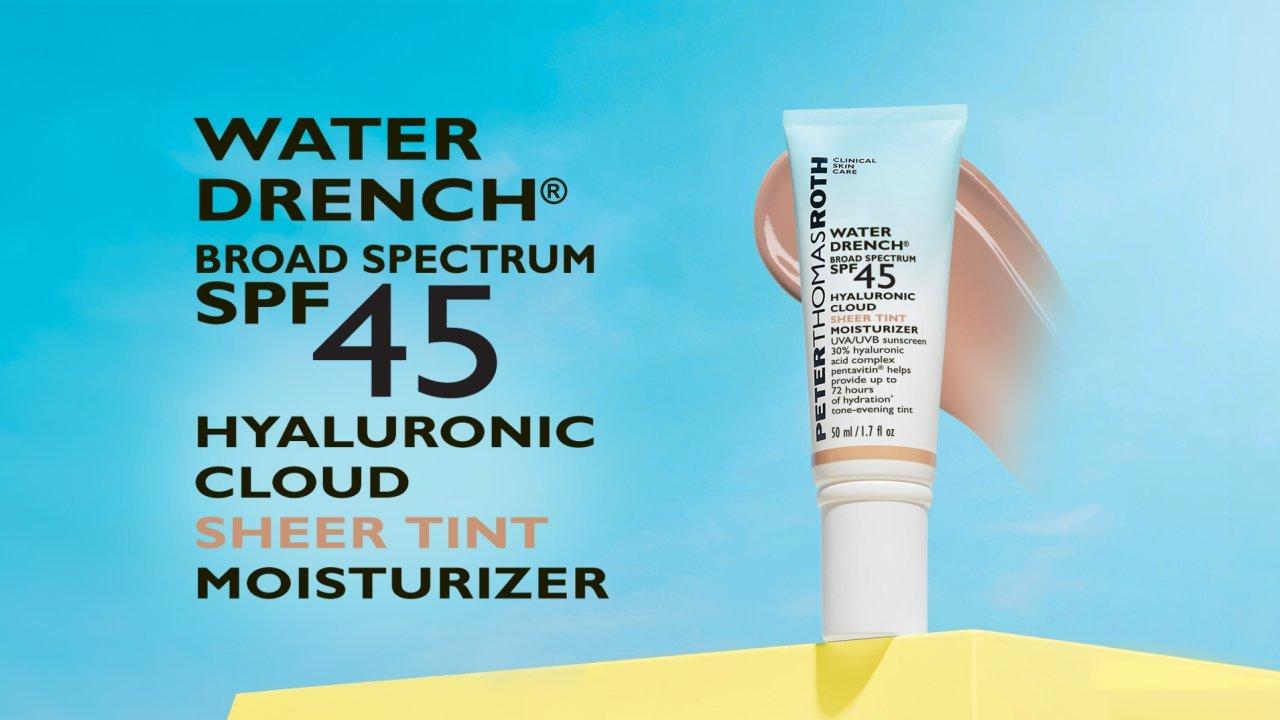 Peter Thomas Roth's Water Drench Hyaluronic Cloud Moisturizer SPF 45 is a water-resistant sunscreen with a hydrating 30% hyaluronic acid complex, unique water-break texture.