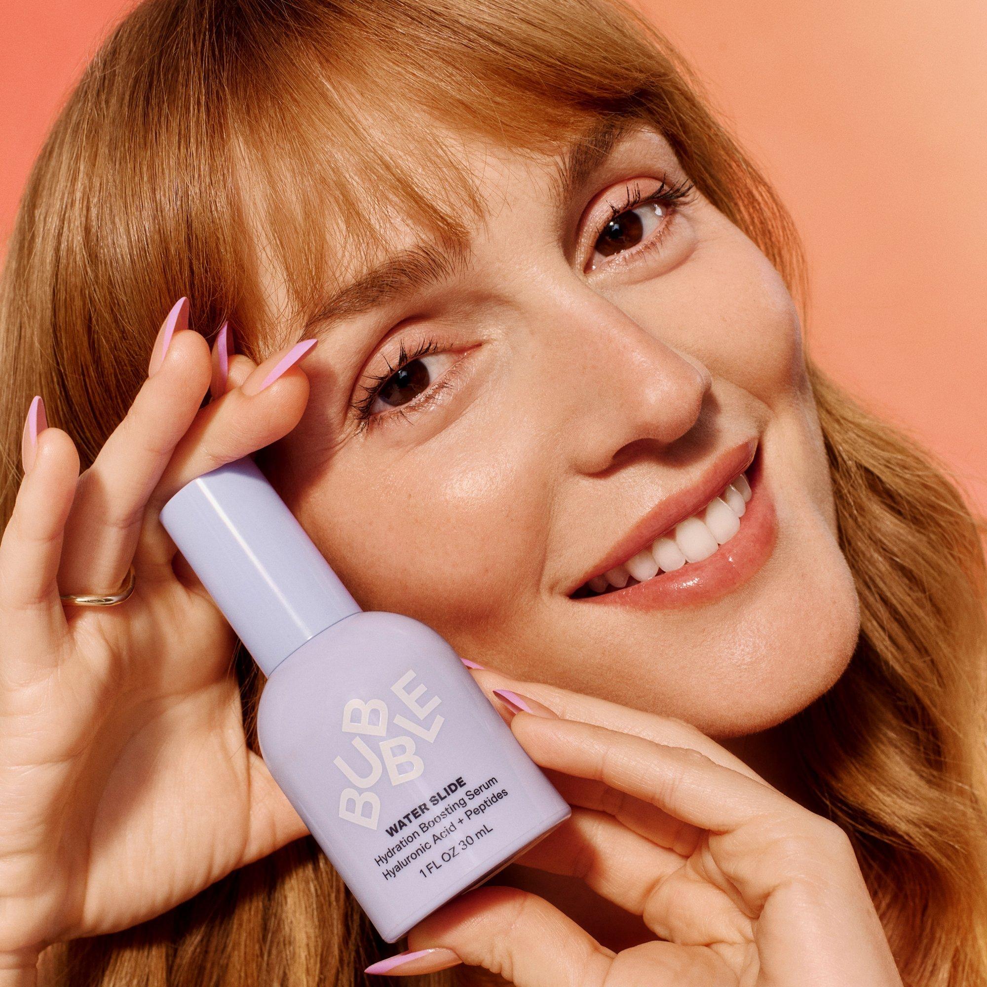 Dry faces prepare to get super-duper soaked with Bubble Water Slide Hydration Boosting Serum Hyaluronic Acid + Peptides! Bubble's hydrating serum draws more water into your skin and renews your skin barrier. Add this to your fave Bubble moisturizer to supercharge your hydration routine.