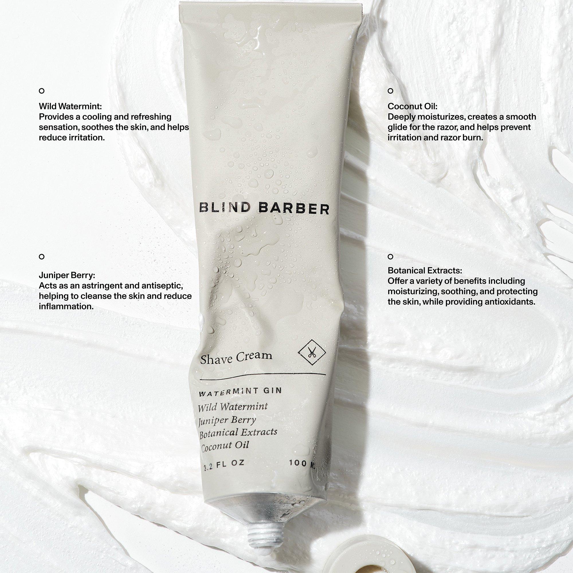 Blind Barber Watermint Gin Shave Cream is a rich, warm, protective lather that acts as a cushion between your razor blade and your skin to prevent irritation and razor burn, leaving the skin exceptionally smooth and moisturized.