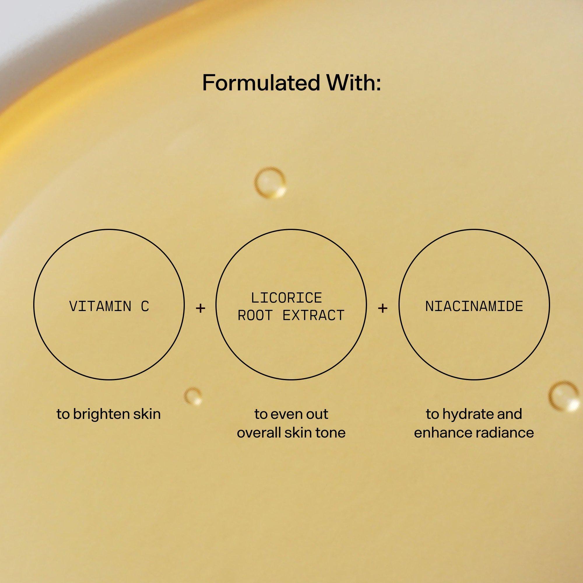 • Vitamin C brightens skin tone while licorice root helps even out overall tone, and niacinamide delivers hydration and even more radiance.