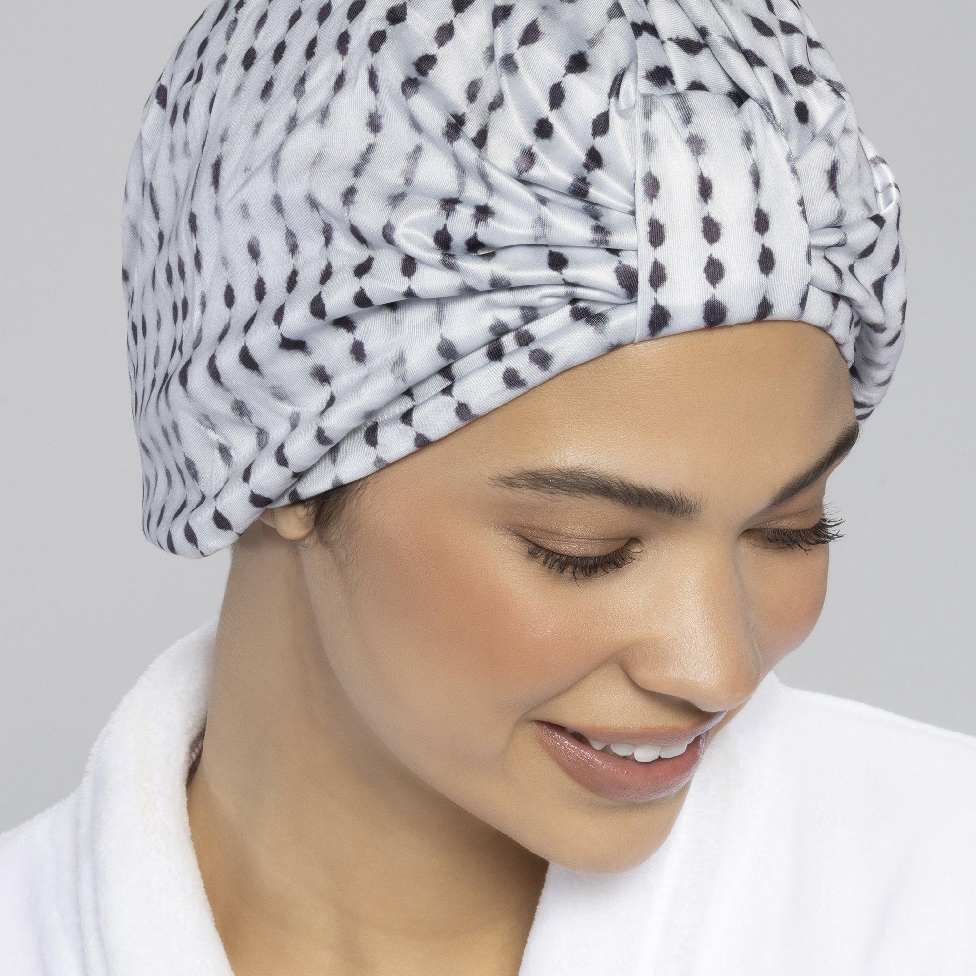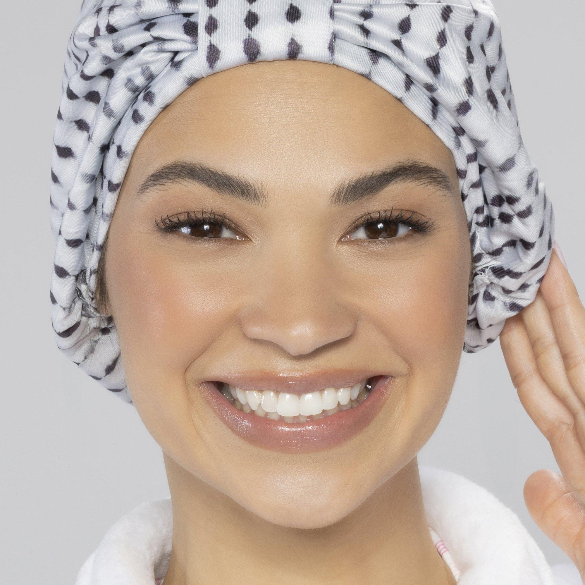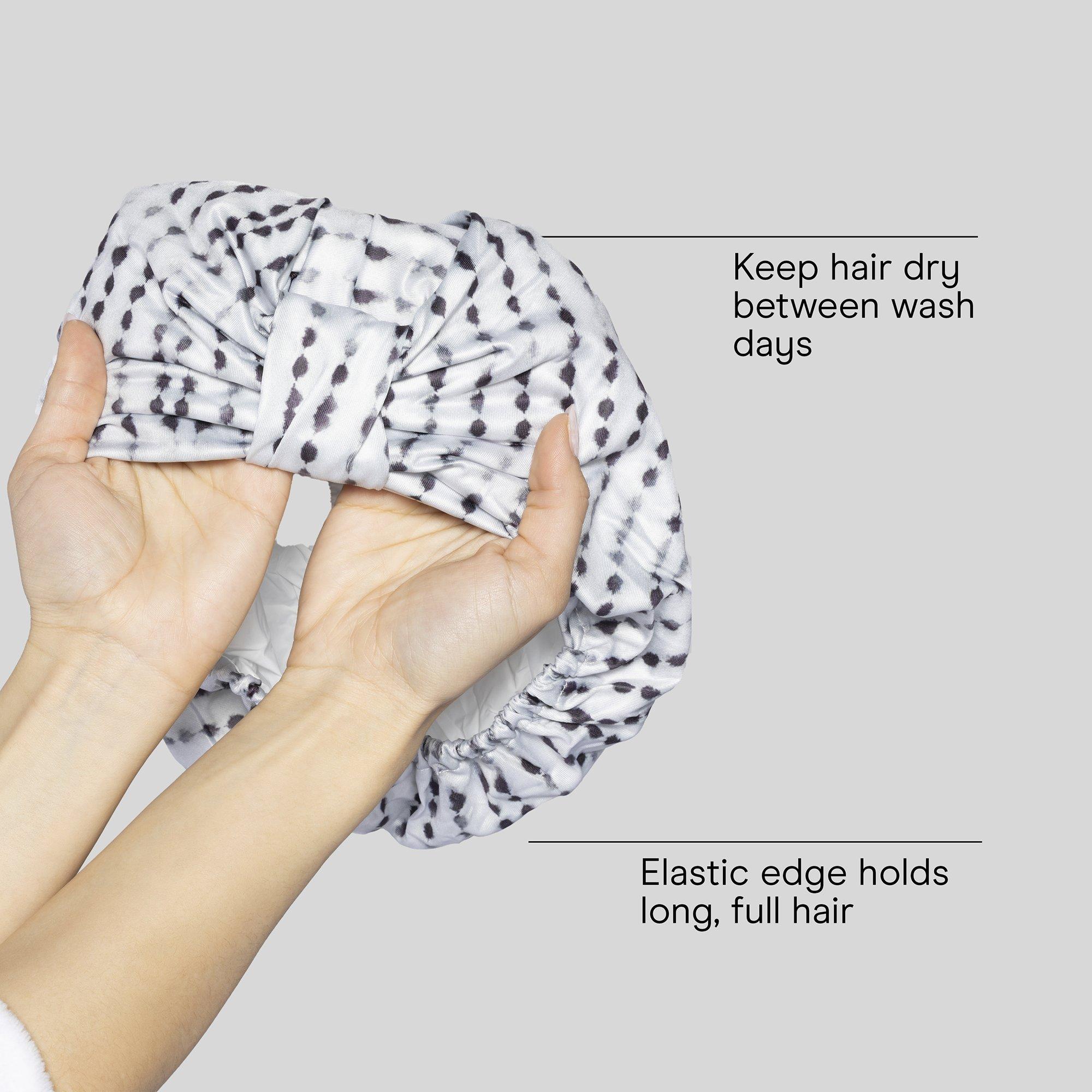 Keep hair dry between wash days with the stylish Conair White & Black Polka-Dot Shower Cap. Designed to cover hair comfortably while you bathe, it helps protect hairstyles so they last longer.
