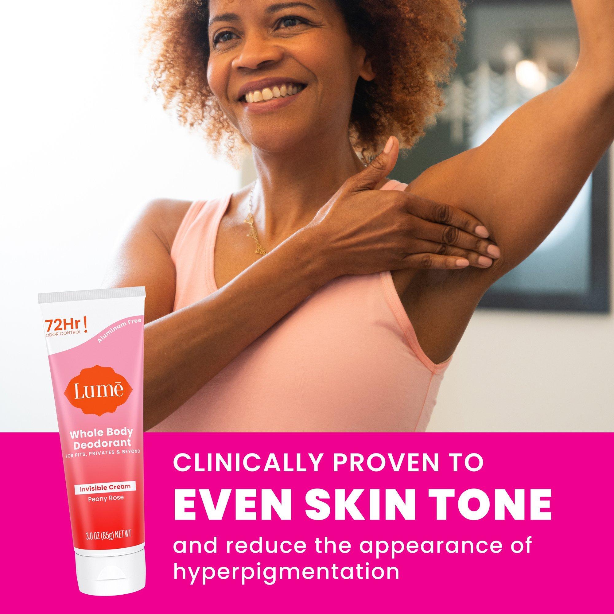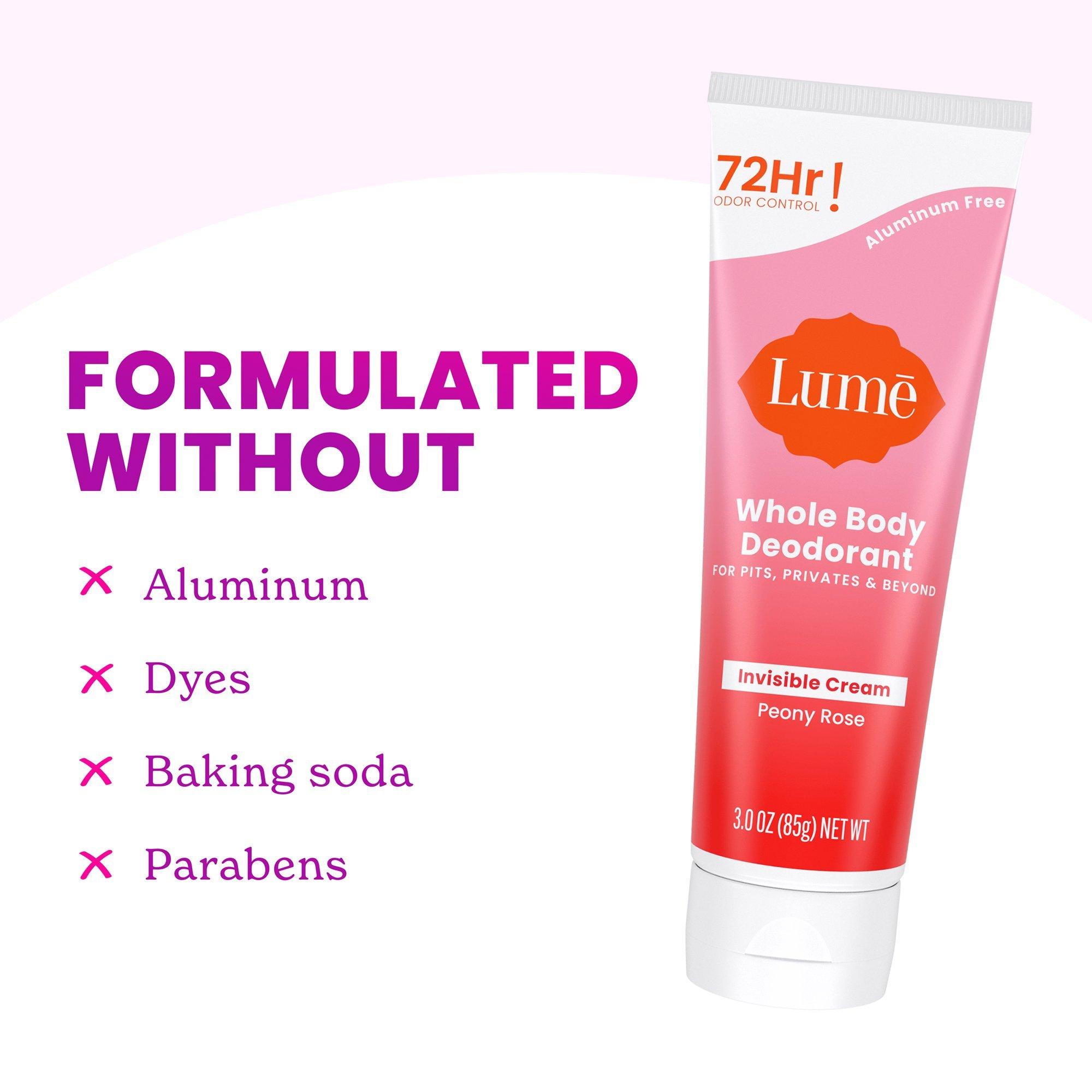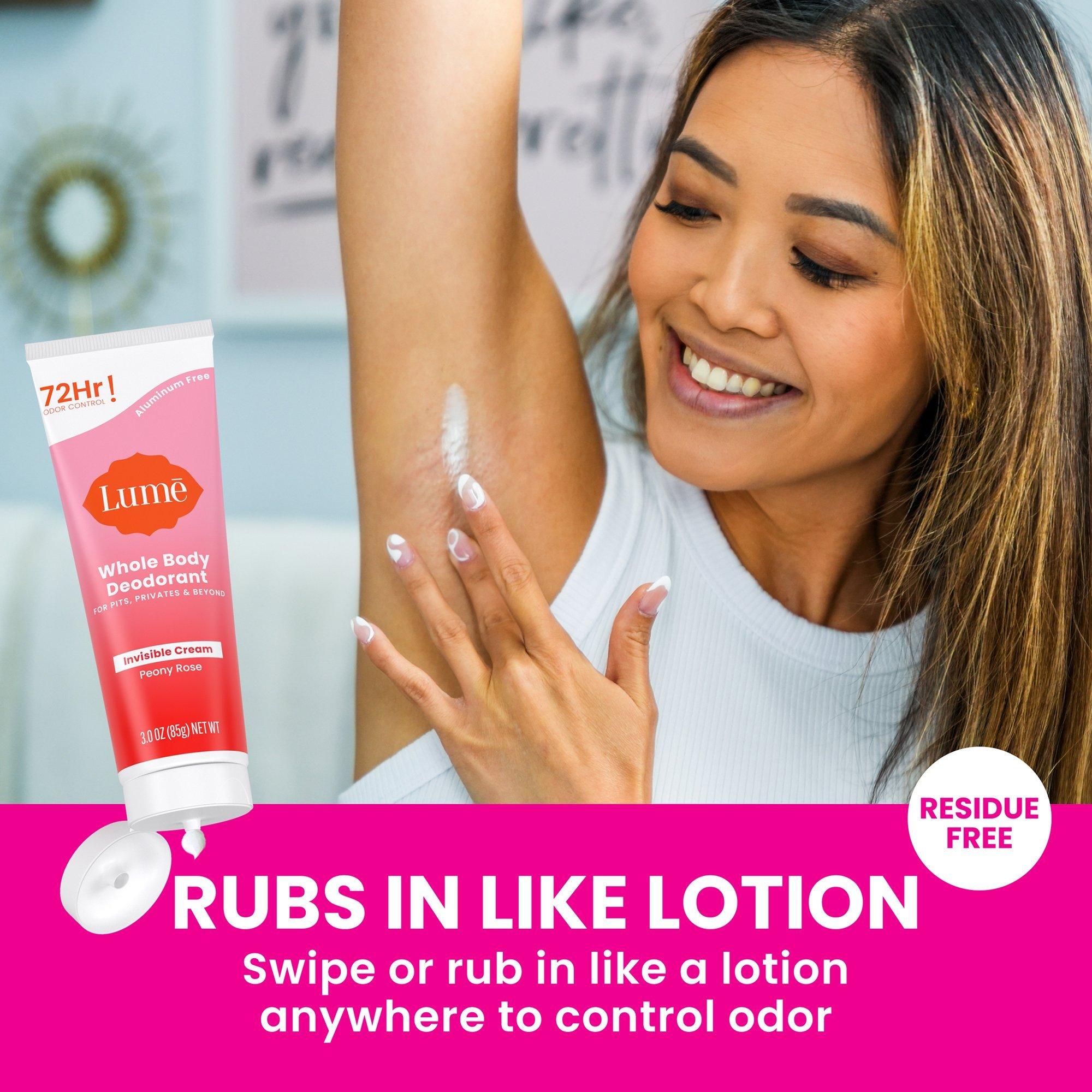 Smell better everywhere with Lume Whole Body Deodorant Invisible Cream Tube for Pits, Privates and Beyond. Armpits aren’t the only place we have odor, and Lume Deodorant is uniquely made to control ALL external body odor.