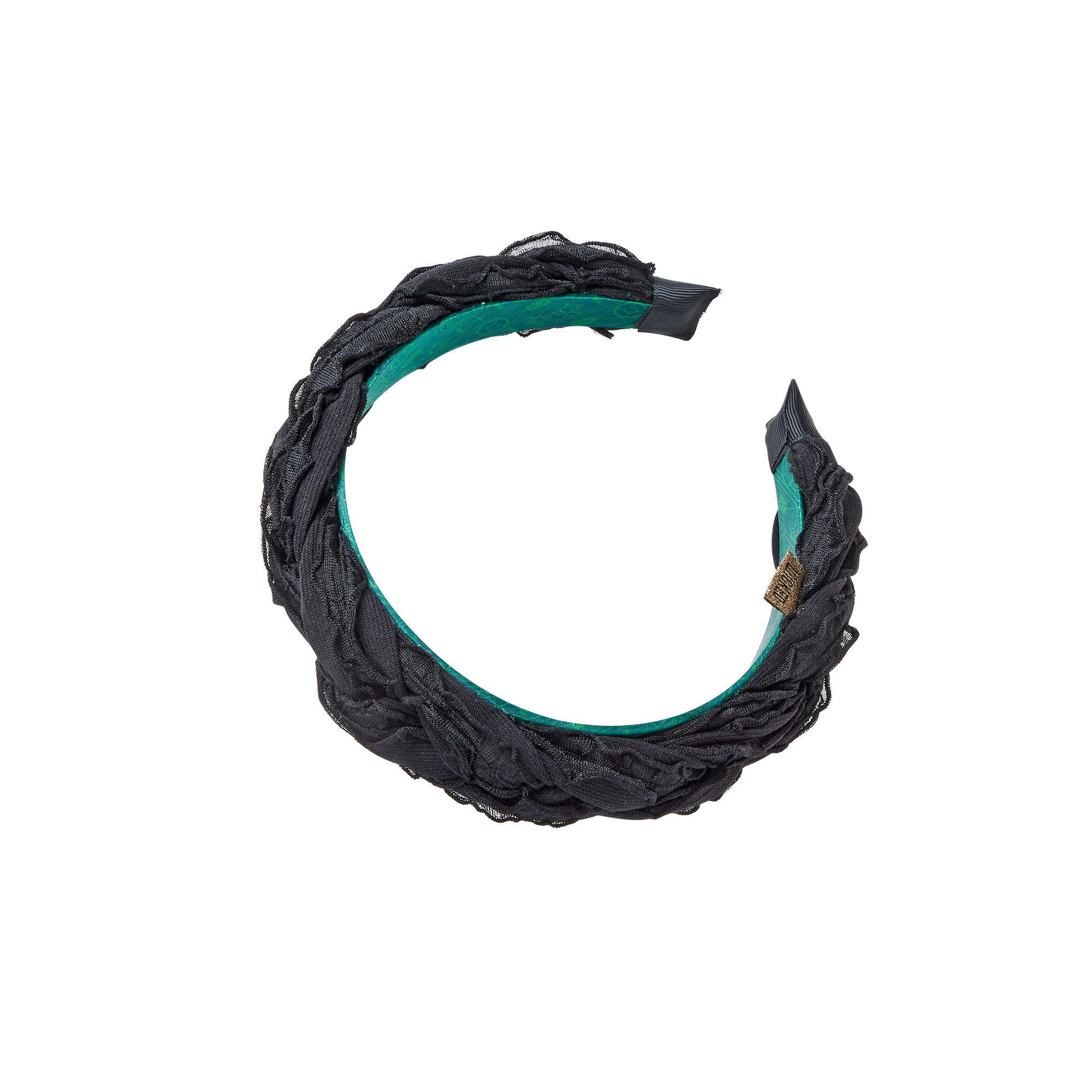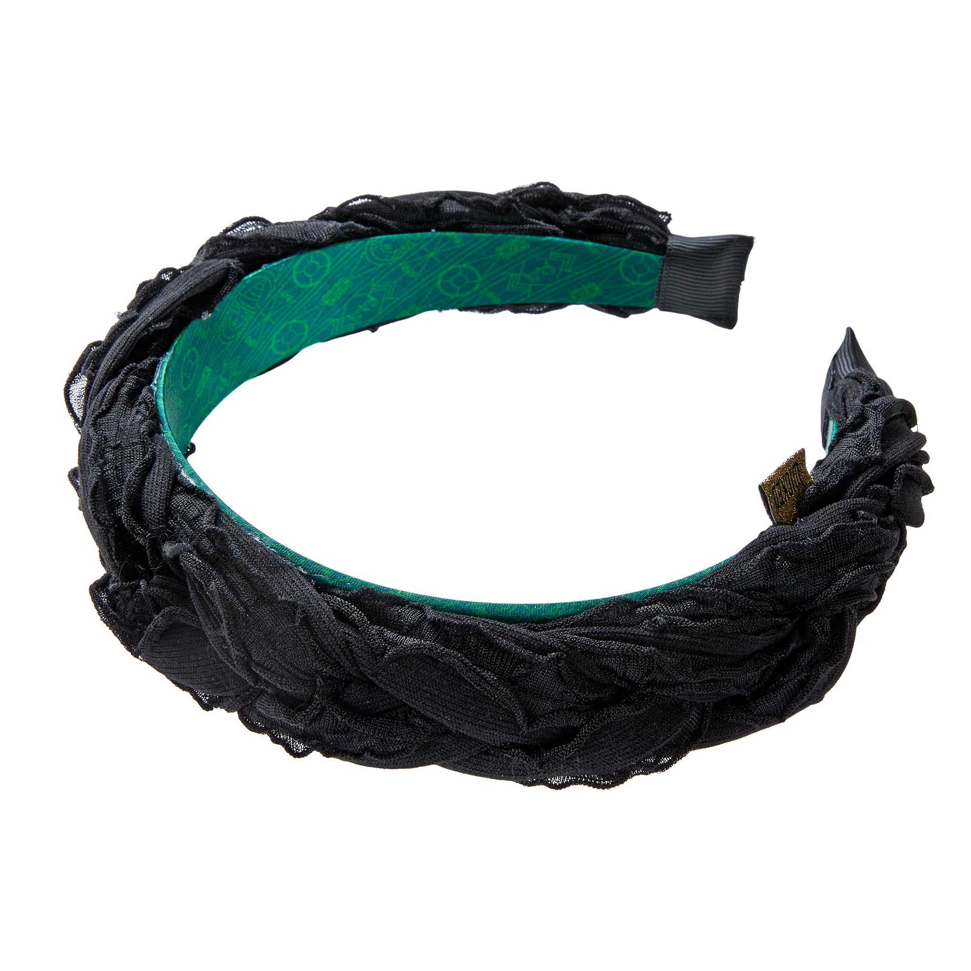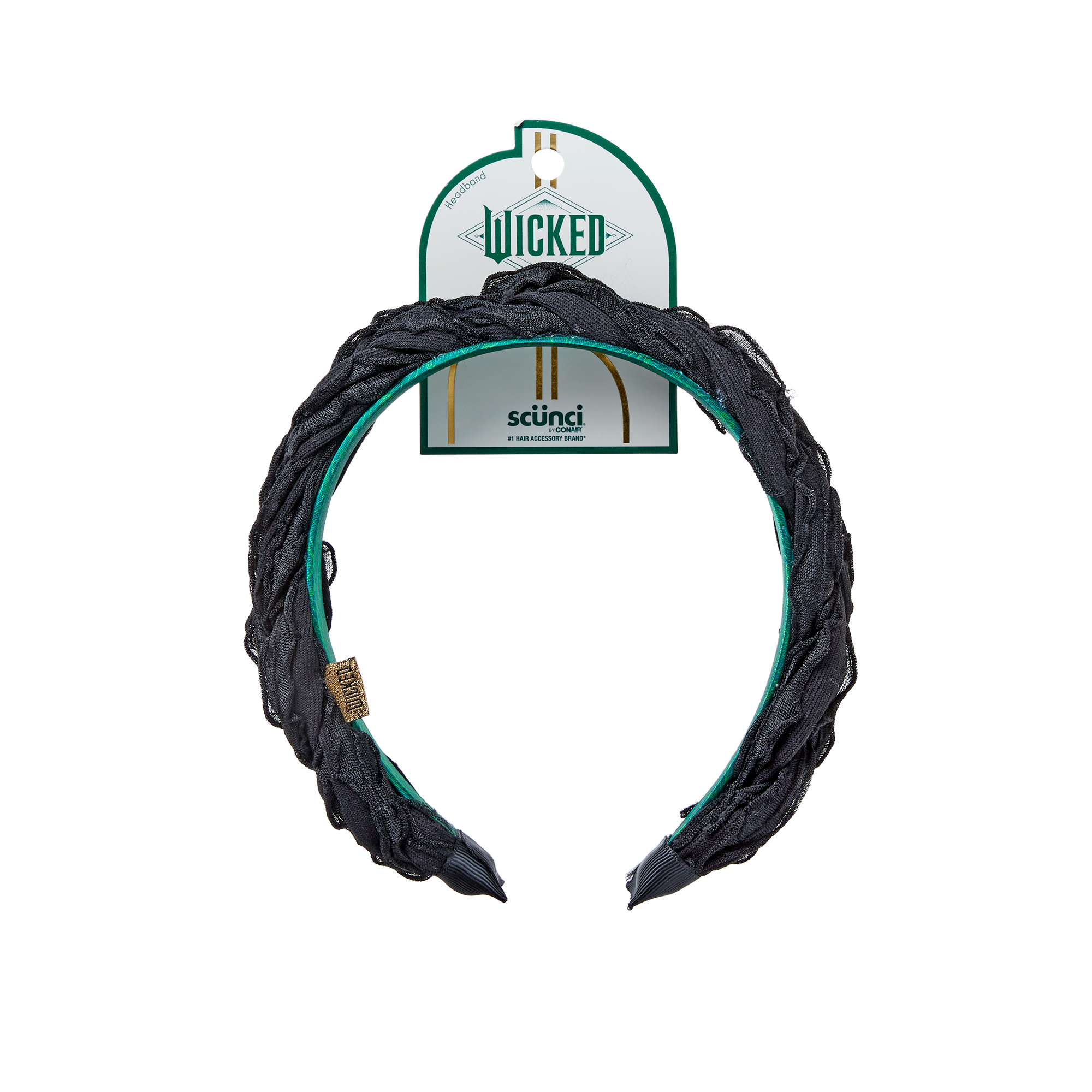 Channel your inner Elphaba—voluminous black gathers are paired with a fierce green geometric lining. A Wicked: For Good themed scünci headband for the unapologetically stylish.