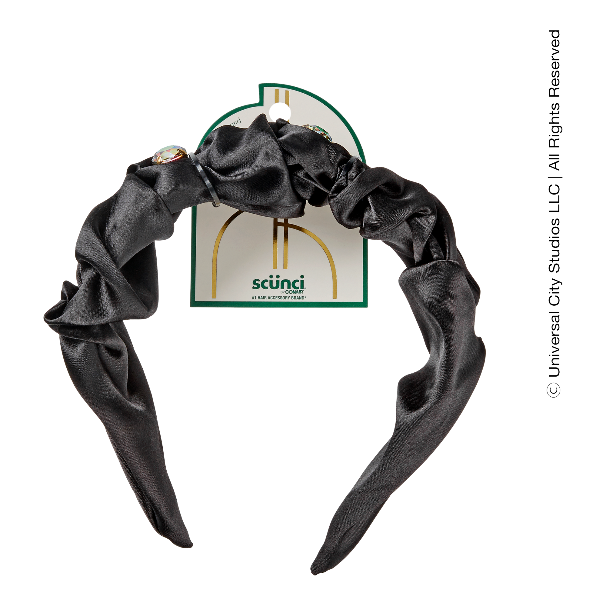 Accessorize with Elphaba-themed elegance. This wide ruched fabric WICKED headband by scünci is topped with faux oil-slick stones for an effect that will turn heads!