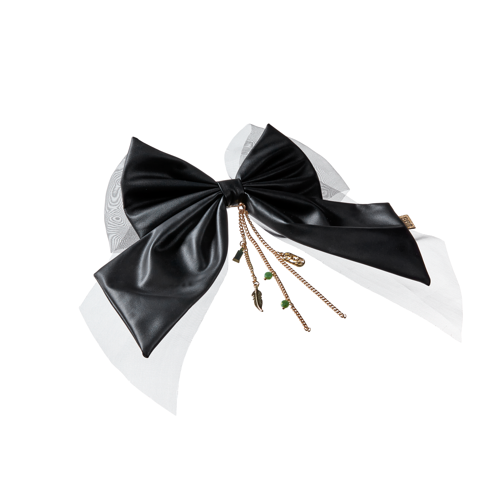 • Black faux leather bow layered with black tulle