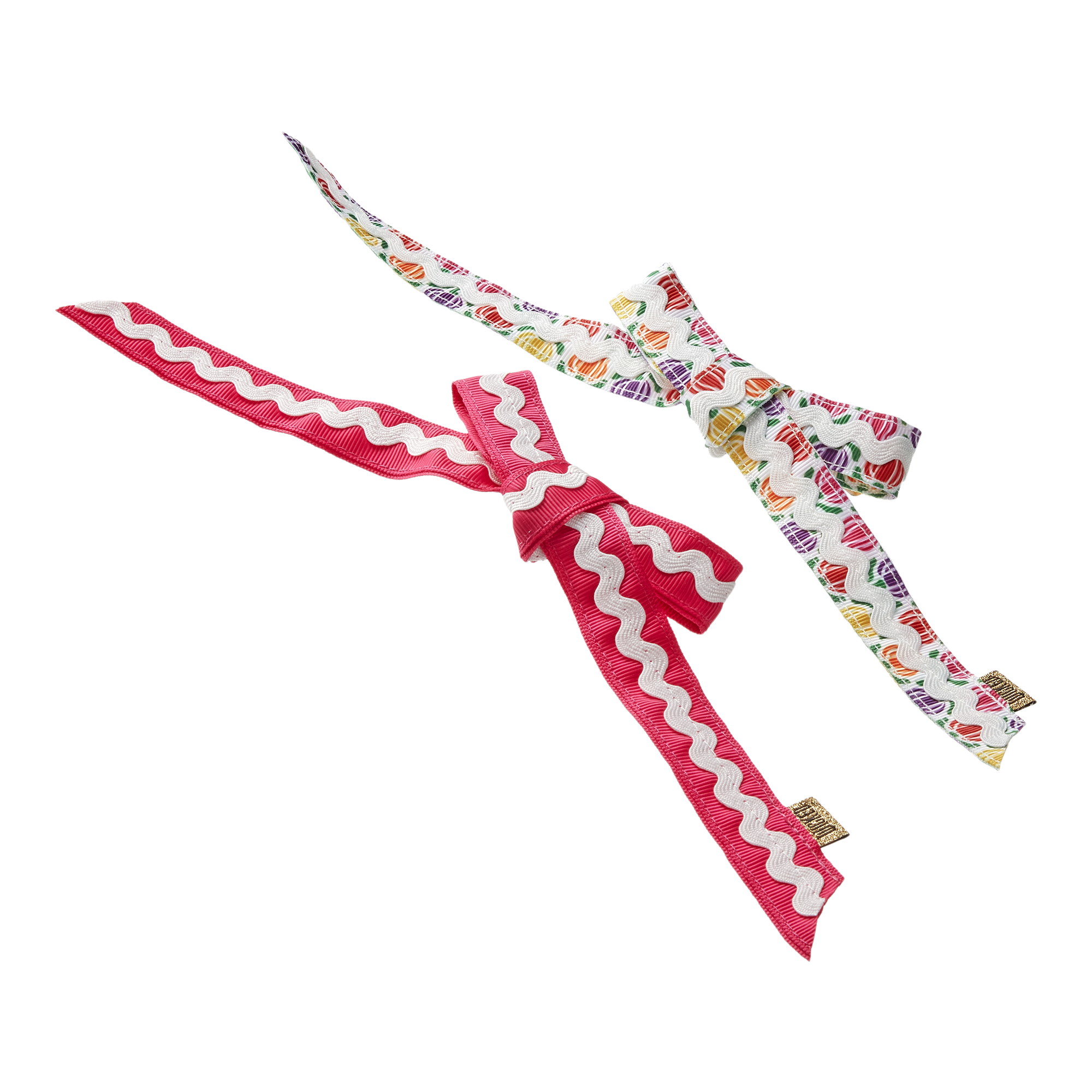 • One features a pink bow with white rickrack, the other a floral design on white