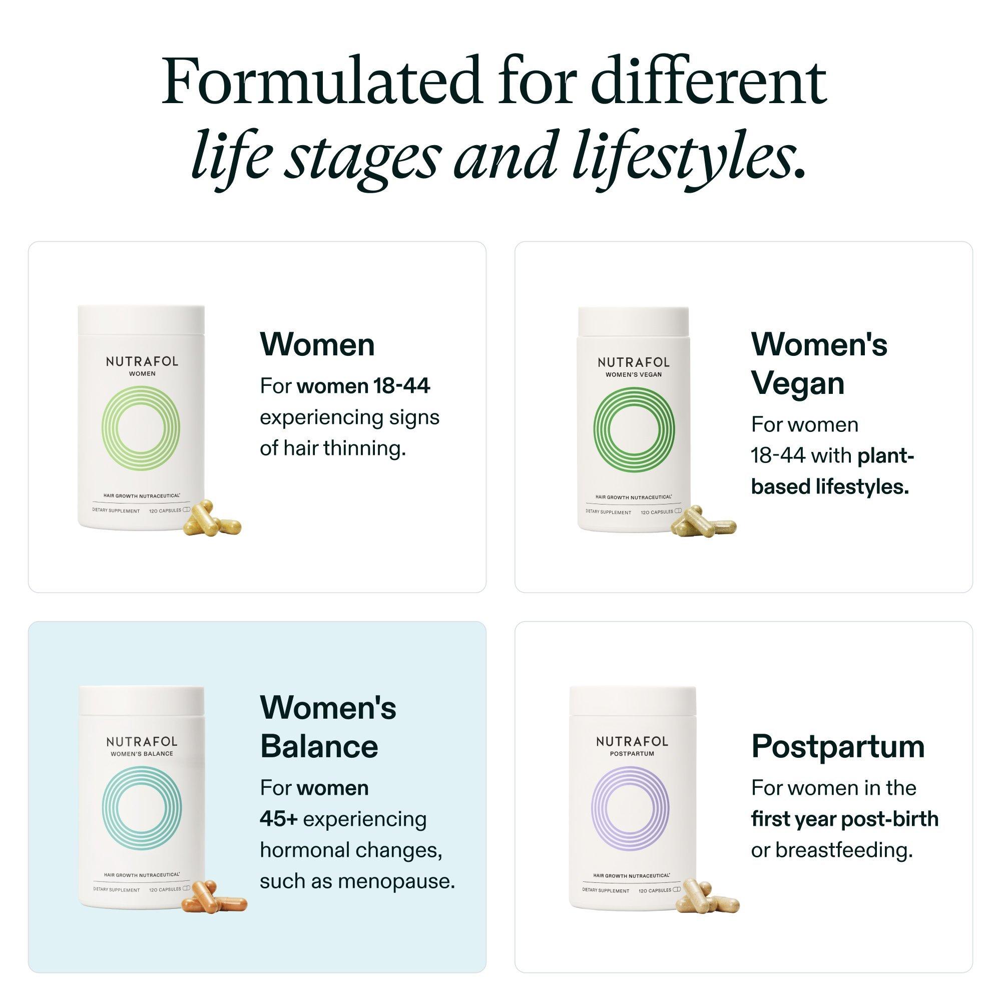 Don’t let aging and hormonal changes impact your hair growth goals. Nutrafol Women's Balance 45+ Clinically Proven Hair Growth Supplement is physician-formulated for before, during, and after menopause with vitamins, minerals, and natural ingredients that support visibly thicker, fuller hair. (1,2)*