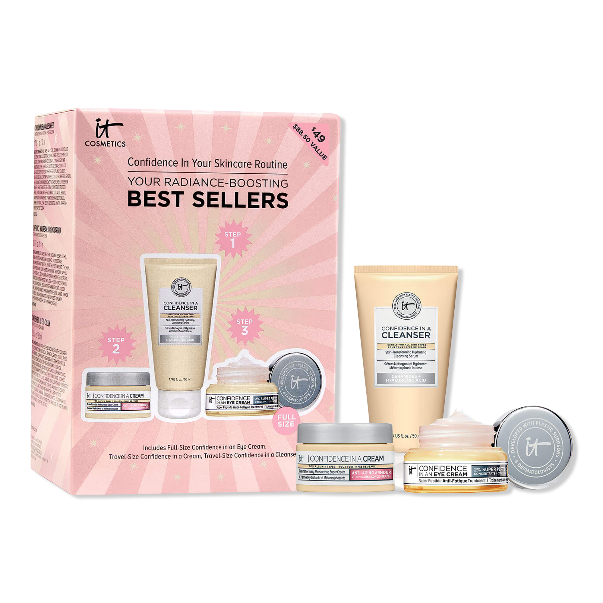 Celebrate confidence in your skincare routine every day (and night!) with this IT Cosmetics 3-piece Your Radiance Boosting Best Sellers Skincare Gift Set including a full-size smoothing eye cream, plus travel sizes of the best-selling hydrating anti-aging cream and face cleanser.