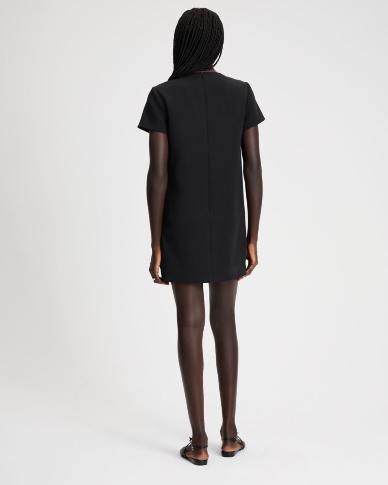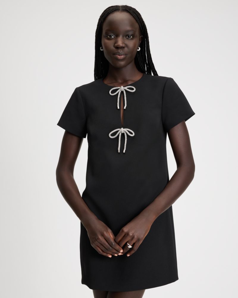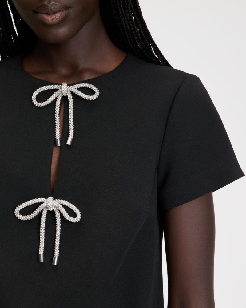 Tailored in smooth double crepe, this classic mini dress is embellished with sparkling rhinestone bows along the front.