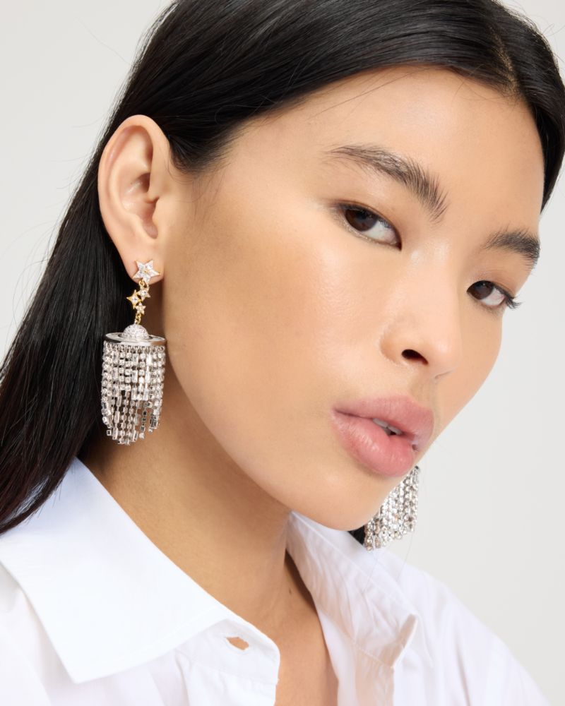 Showcasing crystal-embellished fringes, these statement-making earrings are out of this world.